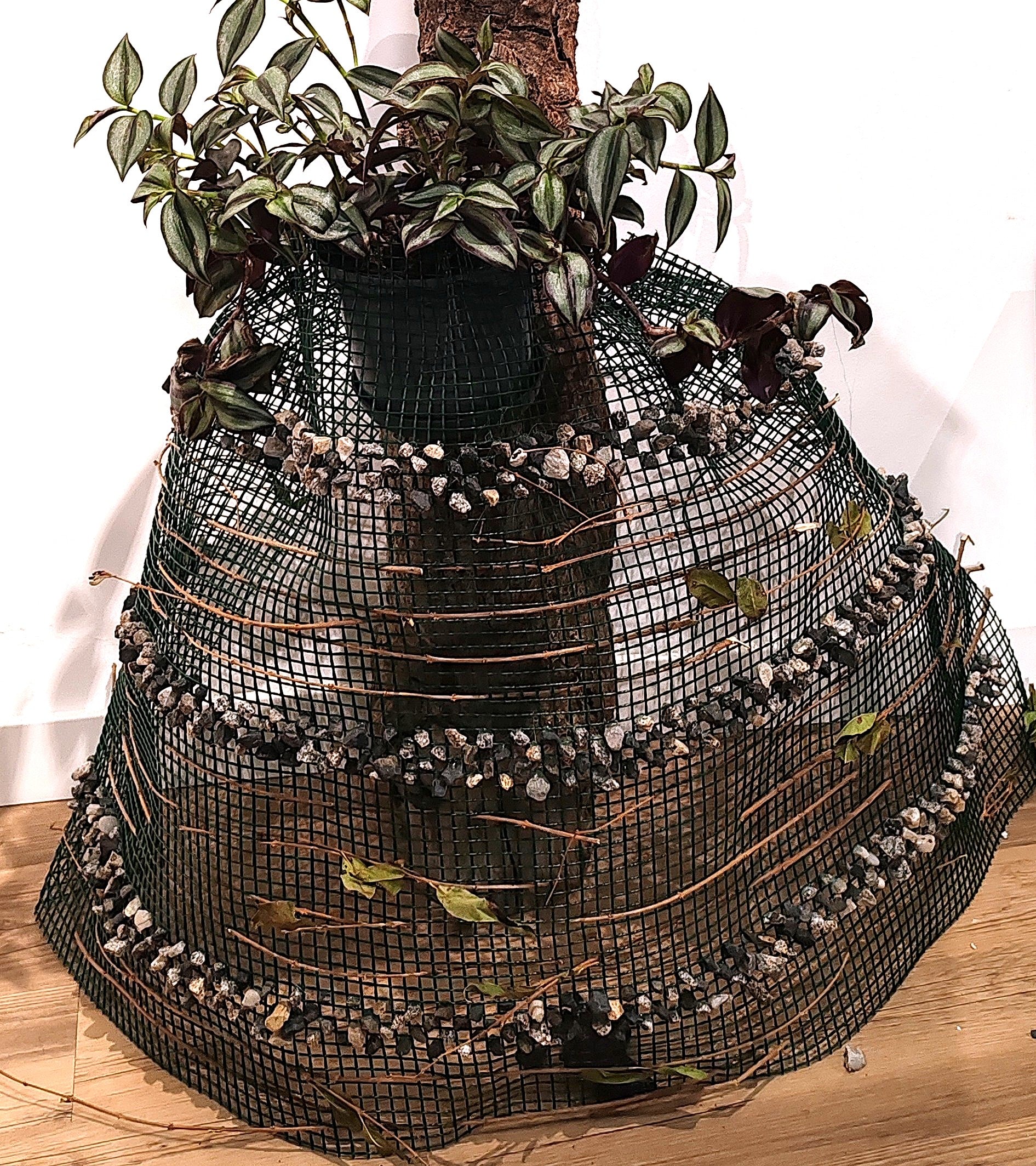 La base de la sculpture est enveloppée d’une armature grillagée en forme de cloche, rythmée par des lignes de petits cailloux et de branches. Cette structure évoque tour à tour une armure, une cage de protection ou une architecture paysagère. La plante se faufile à travers les mailles, contournant les contraintes imposées par le matériau.