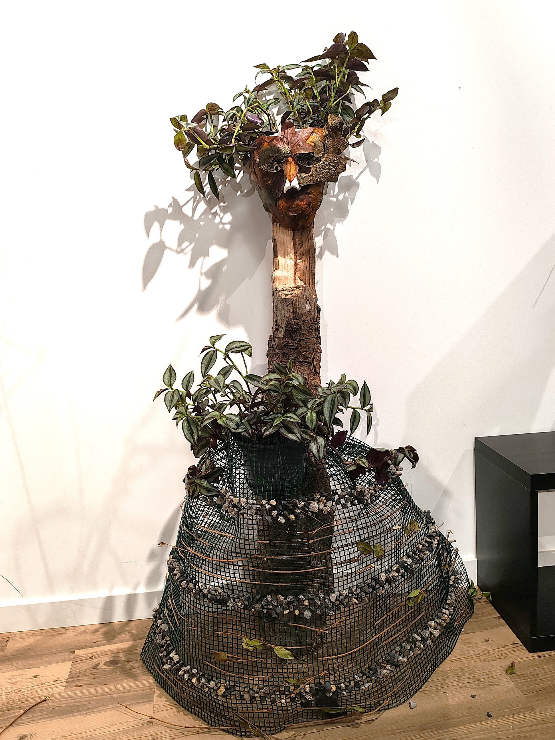 Avec Veilleur-arbre, ArteDelph assemble tronc, végétation, pierres et grillage pour faire surgir une figure hybride, à la fois humaine et végétale. Sur un morceau de bois brut, un visage-masque est composé de feuilles séchées, d’écorces et de fragments organiques. De ce crâne-feuillage jaillissent des plantes vivantes, comme une chevelure en croissance.