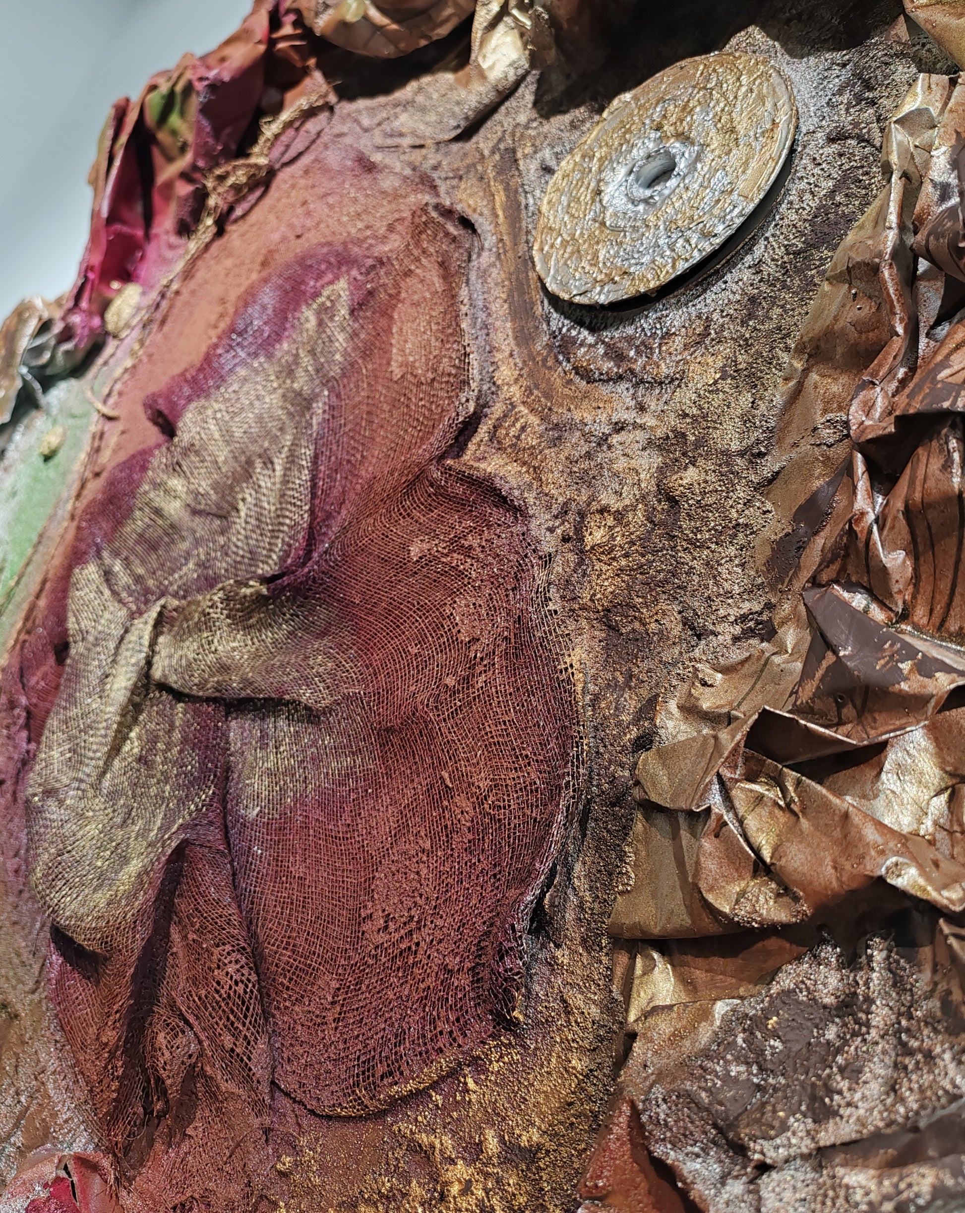 Au centre, un cocon de fibres se déploie, entre refuge et métamorphose. Il pourrait être une fleur prête à s’ouvrir, une empreinte végétale ou le cœur secret d’une pierre. À sa droite, un cercle lumineux se lève tel un astre ancien, gardien silencieux de cette alchimie.