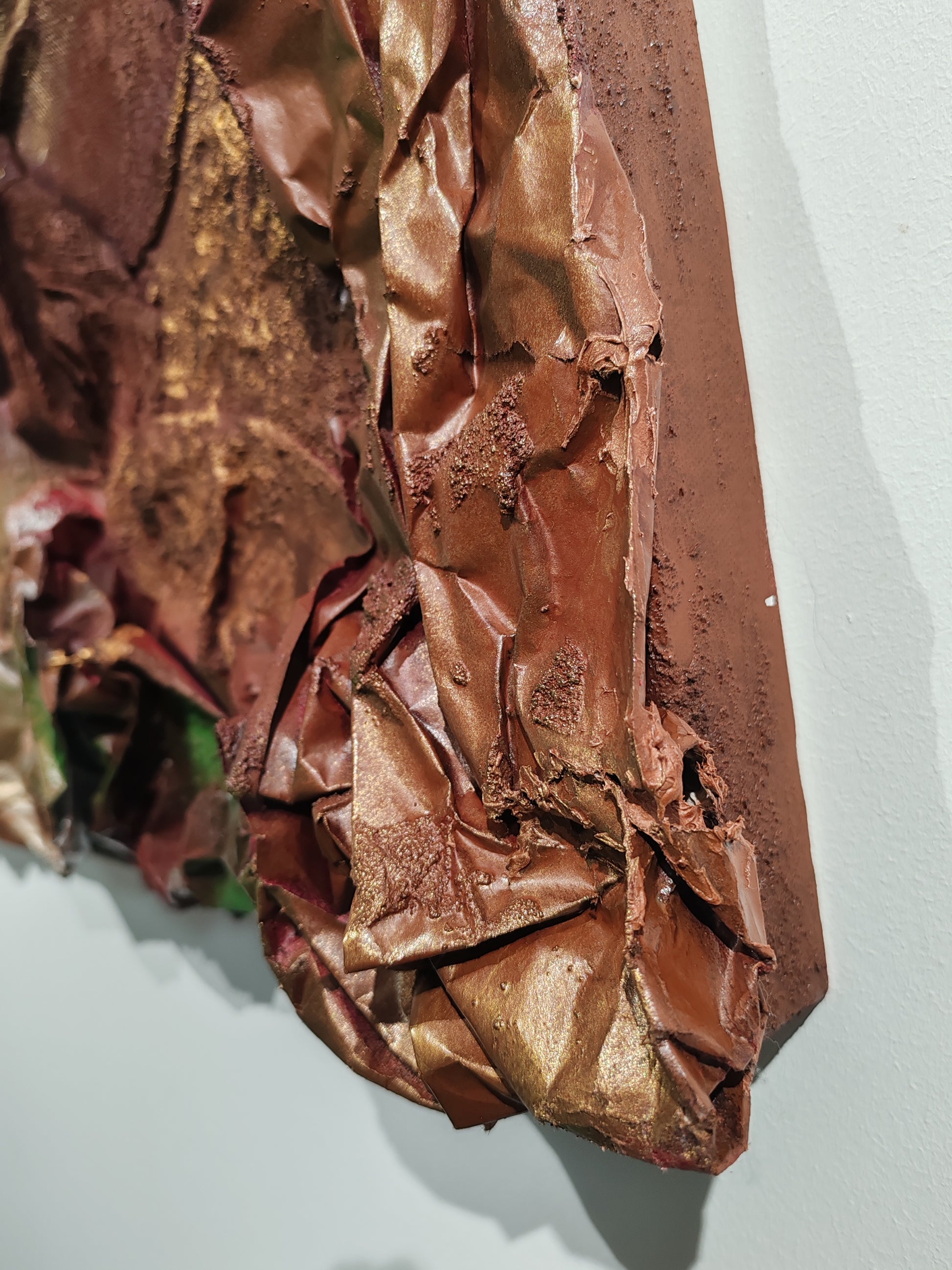 Les pigments chauds – cuivre, rouille, or – vibrent comme un sol incandescent, tandis que le vert surgit par éclats, fragile mais tenace, comme une promesse de vie.