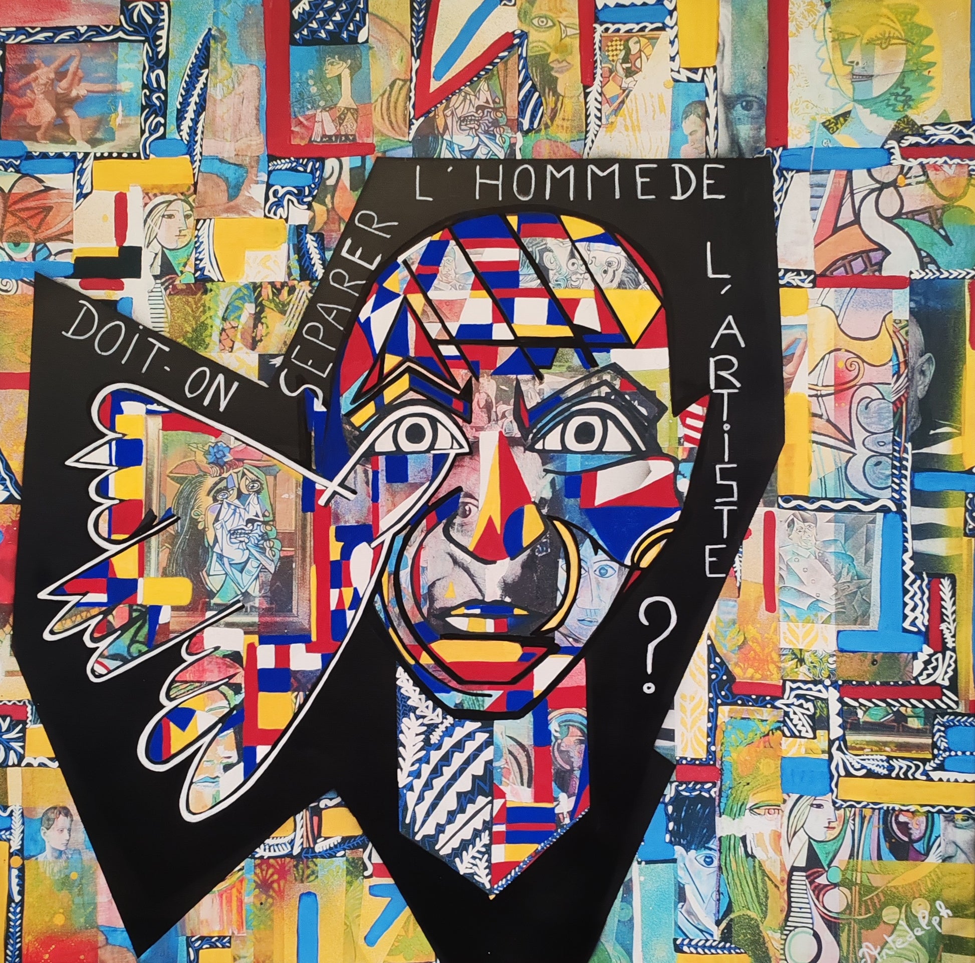 大師巴勃羅·畢卡索的肖像,畫在一系列代表他主要作品的拼貼和繪畫上。