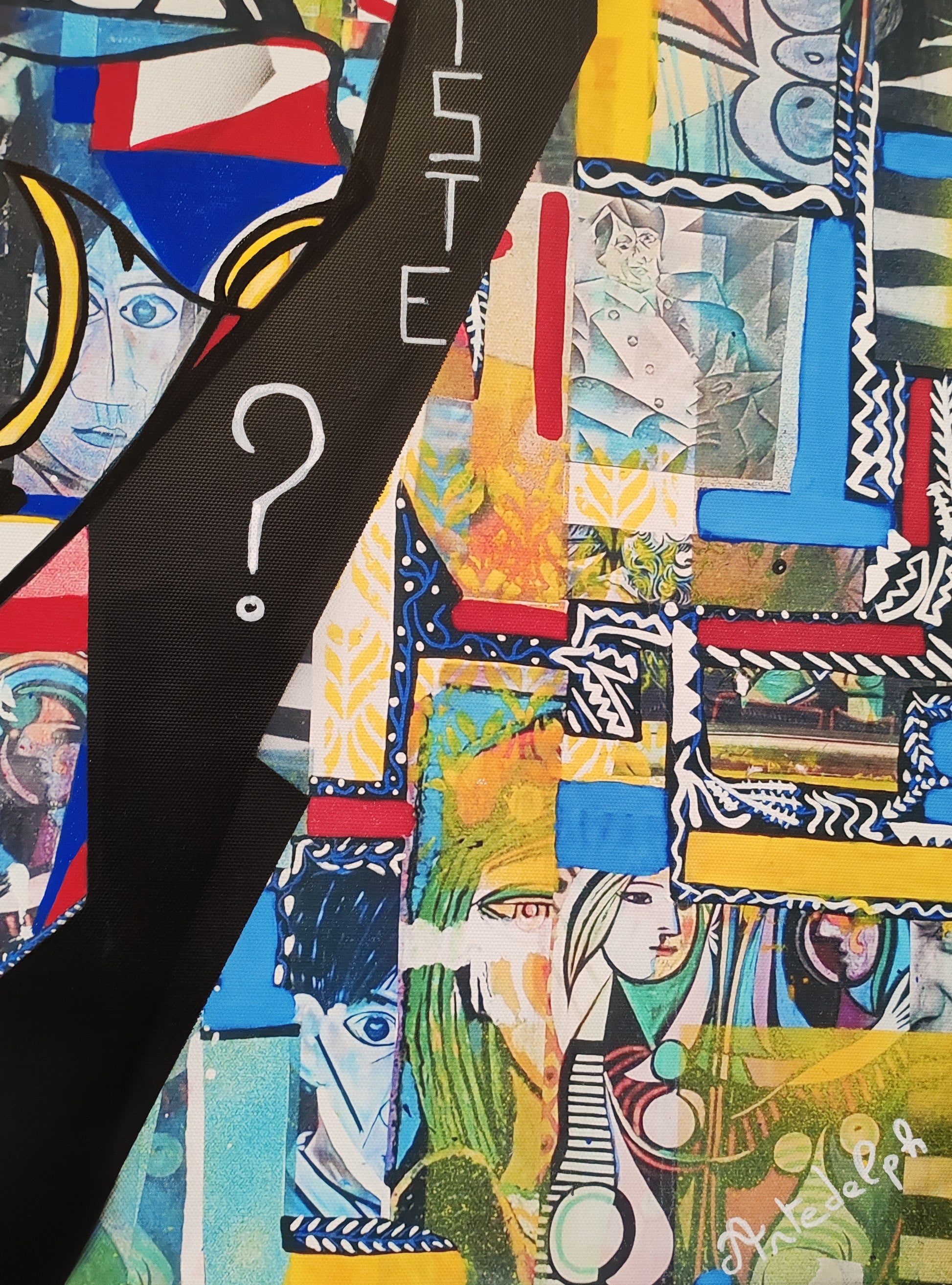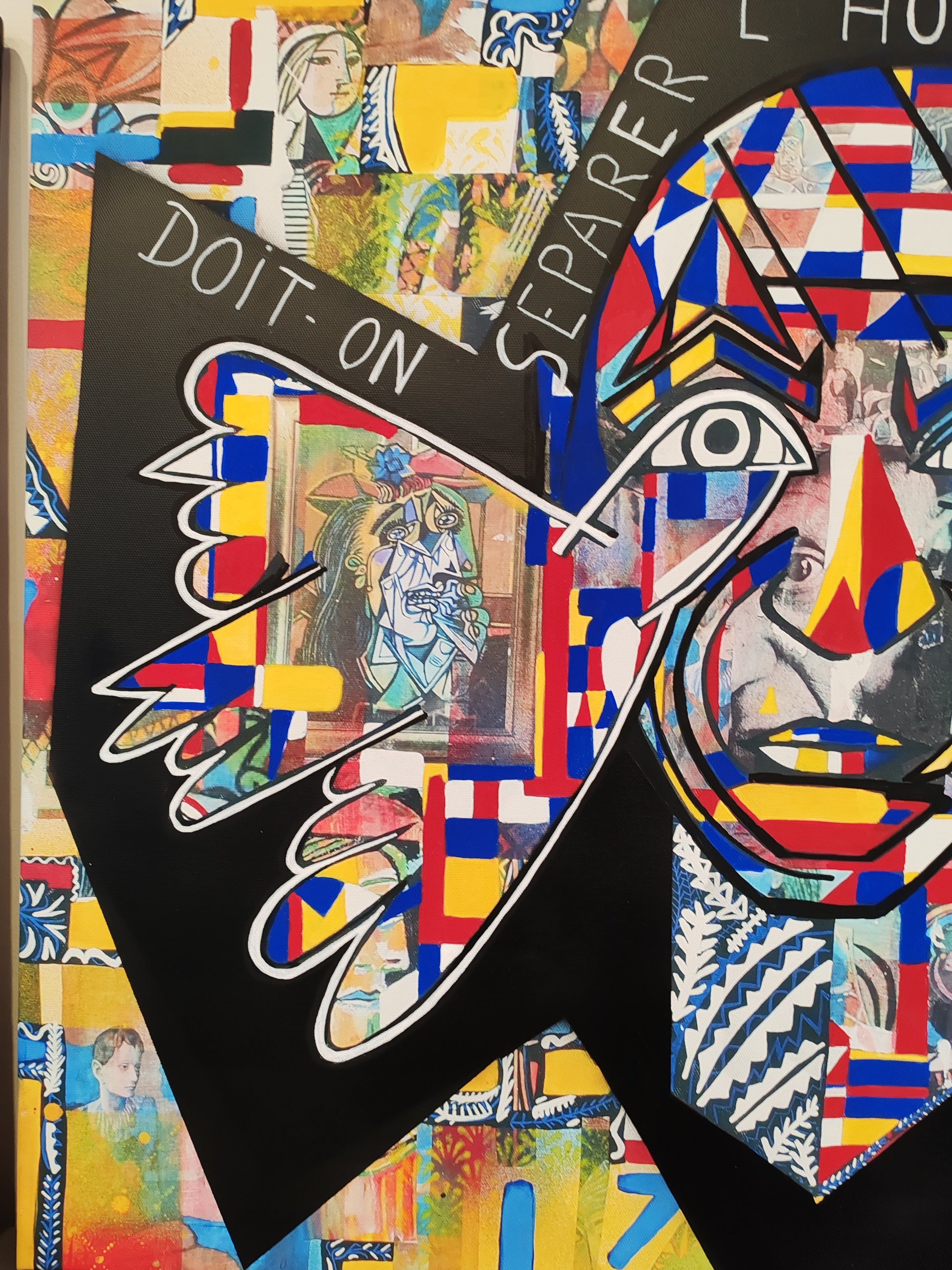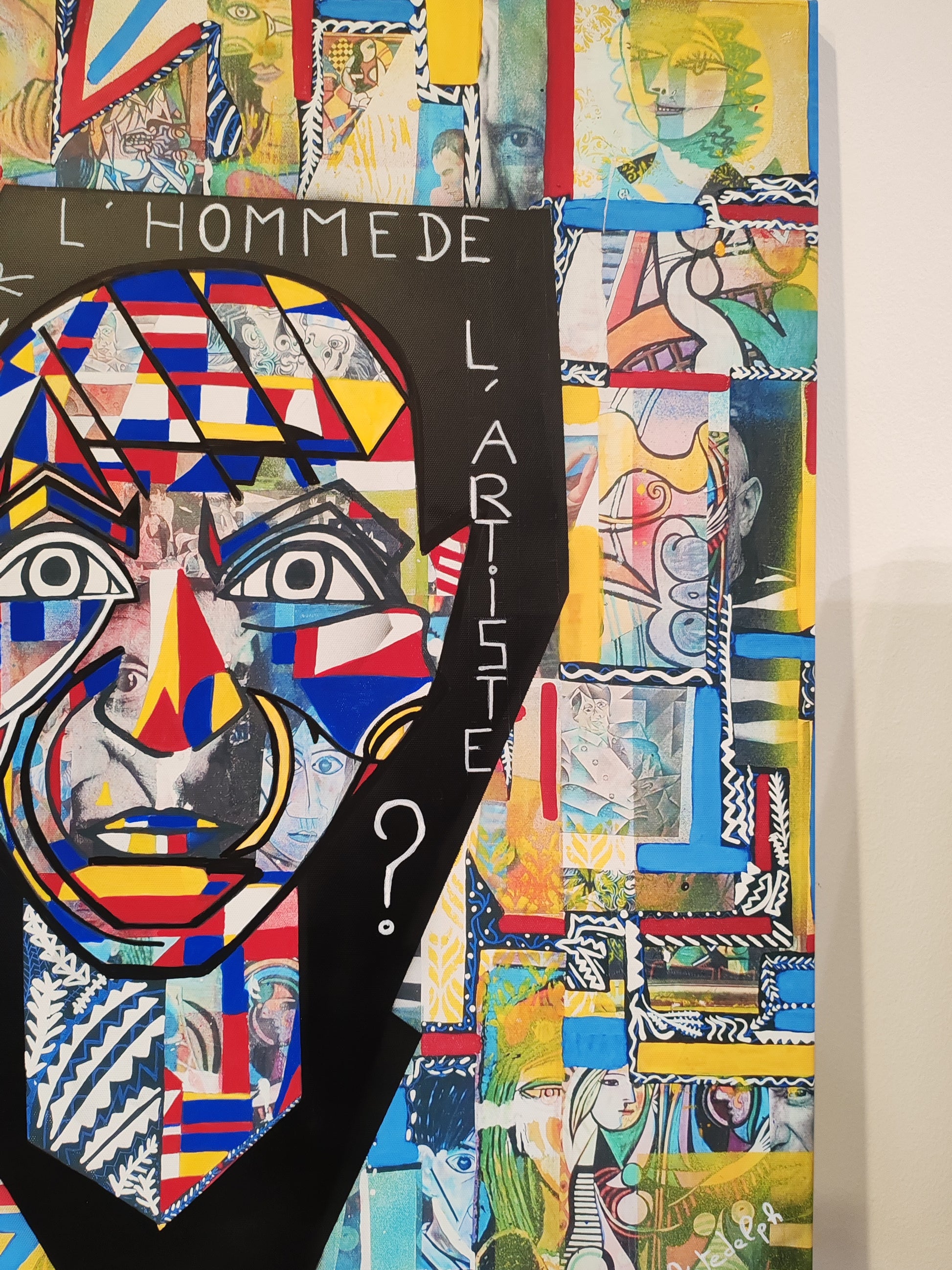 這幅畫作不僅向畢卡索致敬,也透過其作品中的色彩和幾何形狀向蒙德里安致敬。背景刻意營造出類似街頭藝術的氛圍,彷彿牆上貼滿了撕裂的海報。